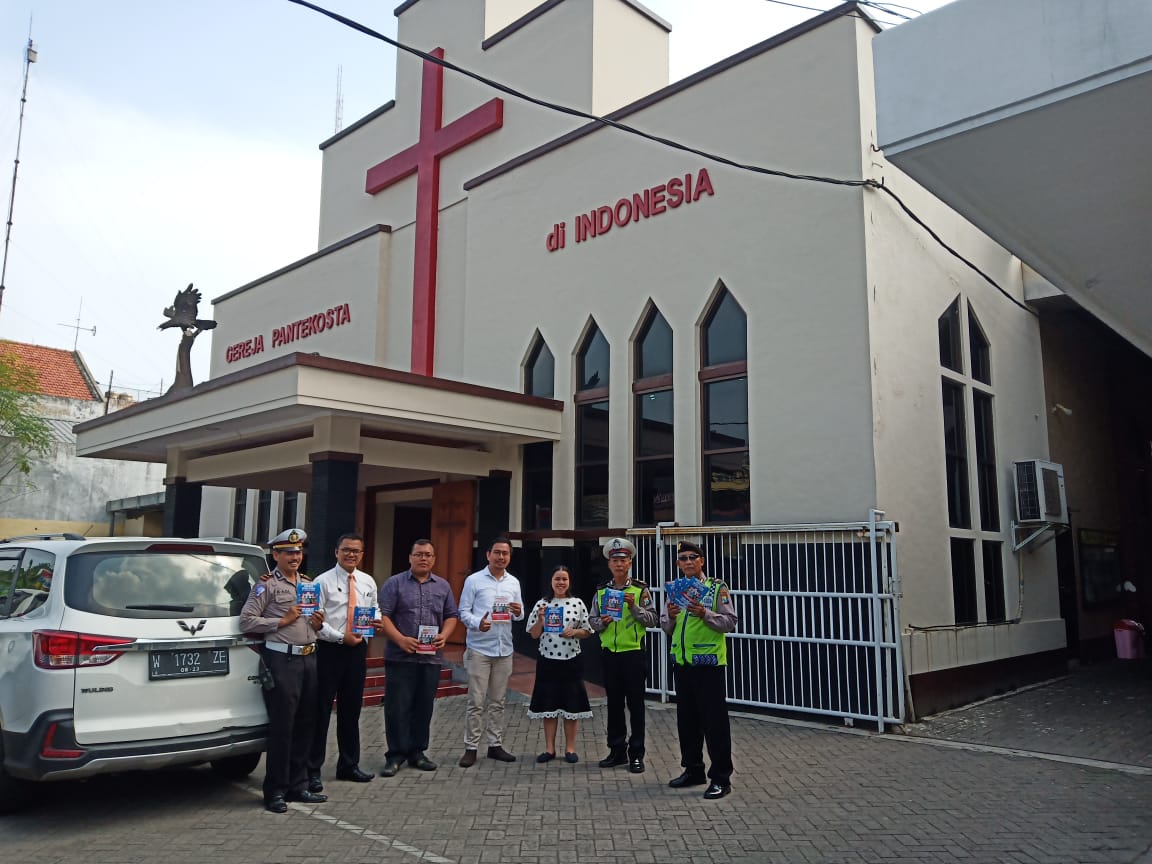 Sambil melakukan pengamanan, personil Polsek Pabean Cantikan juga membagikan brosur program SPKT door to door kepada para jemaat usai kebaktian berlangsung.