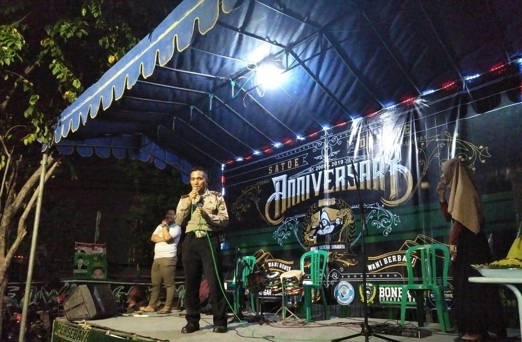 Salah satunya yang dilakukan Ipda Eko Mustaghfirin, Panit Binmas Polsek Asemrowo, saat menghadiri acara ulang tahun ke 10 Bonek Zedenk, yang diadakan di depan Balai RW 04 Kelurahan Asemrowo, Minggu malam, 7 April 2019.