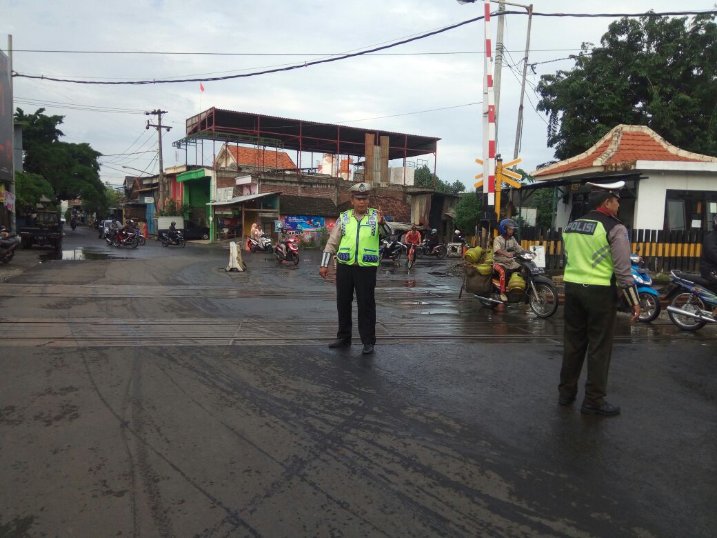 Seperti yang terlihat pada Kamis pagi, 21 Juni 2018, saat dua orang personil Polsek Asemrowo, mengatur kendaraan yang melintas, khususnya di sekitar rel kereta api Jalan Tambak Mayor.