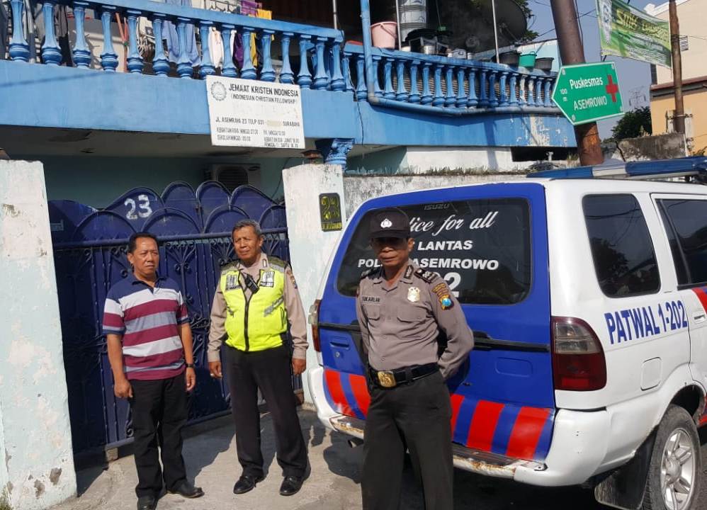 Seputarperak.com- Pengamanan dilakukan Polsek Asemrowo, Polres Pelabuhan Tanjung Perak di Gereja Mess Panen Raya, Jalan Asem Raya, Minggu pagi, 19 Mei 2019.
