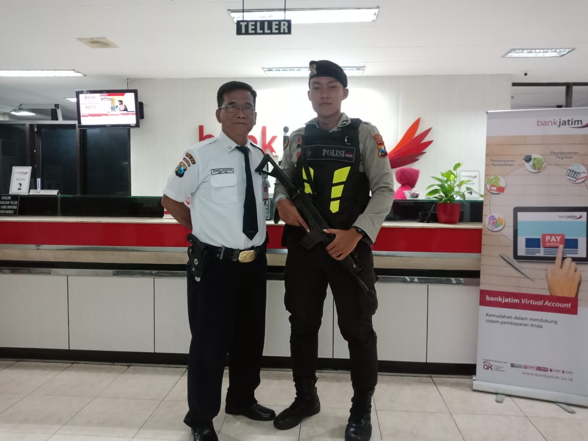 Seputarperak.com- Pengamanan dilakukan personil Satsabhara Polres Pelabuhan Tanjung Perak di kantor Bank Jatim, Jalan Perak Timur. Kegiatan ini dilakukan setiap hari, untuk mengantisipasi tindak kriminalitas.