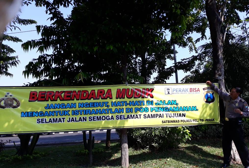 Seputarperak.com- Pemasangan spanduk himbauan mudik aman dilakukan anggota Brika Slamet Karyono, anggota Satbinmas Polres Pelabuhan Tanjung Perak di seputaran Jalan Perak Barat, Sabtu, 1 Juni 2019.