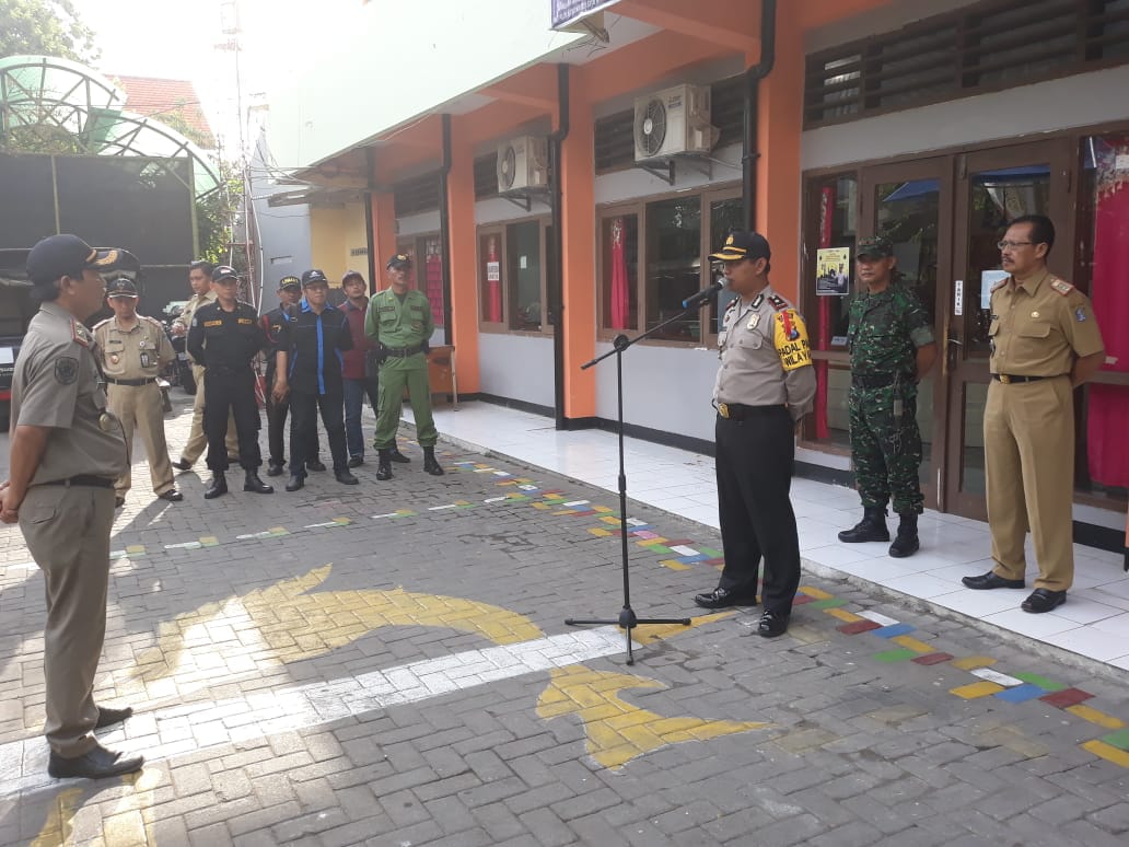 Puluhan personil gabungan dari Polsek Asemrowo, Satpol PP kecamatan serta petugas hansip berkumpul di halaman kantor Kecamatan Asemrowo.