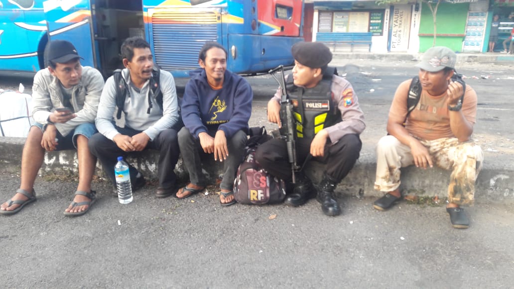 Seputarperak.com- Patroli dialogis dilakukan personil Satsabhara Polres Pelabuhan Tanjung Perak dengan para calon penumpang kapal di Pelabuhan Ujung, Senin sore, 3 Juni 2019.