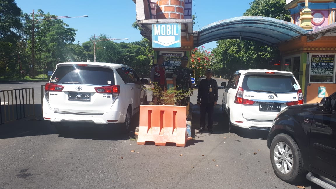 Seputarperak.com- Pengamanan dilakukan Aipda Dhanu Kriswana, Babinkamtibmas Sukolilo Baru, Polsek Kenjeran, Polres Pelabuhan Tanjung Perak di pintu masuk lokasi wisata Kenpark, Rabu pagi, 5 Juni 2019.
