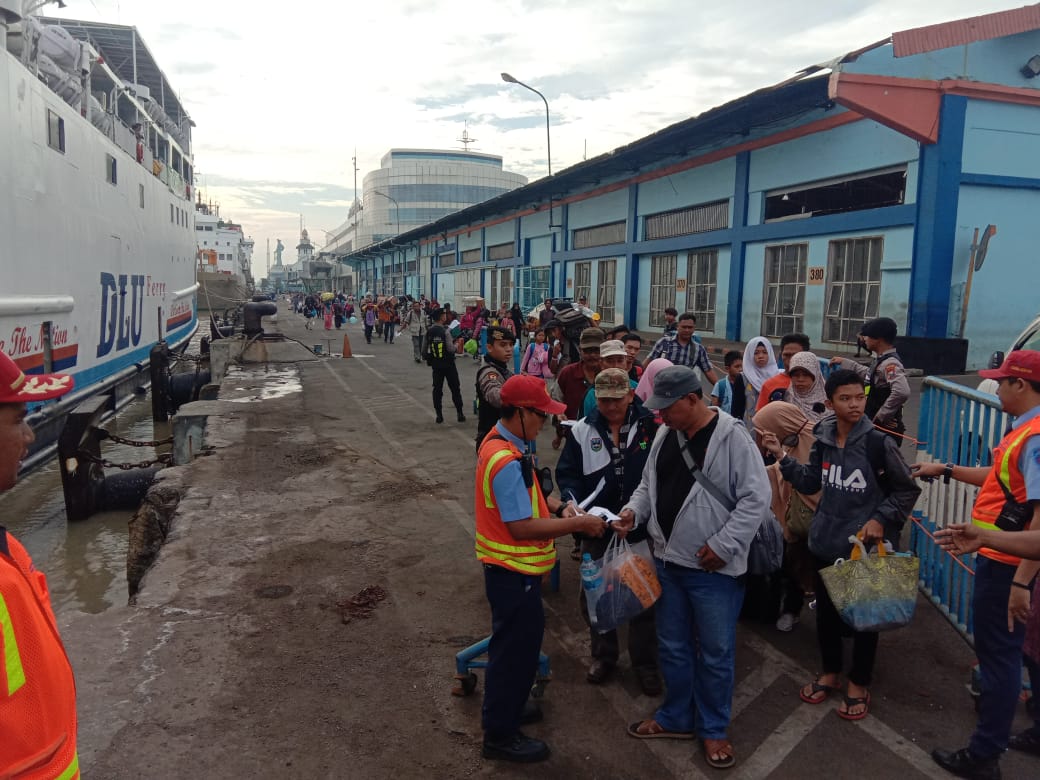 Beberapa personil terlihat berjaga dan mengawasi aktivitas para penumpang yang naik ke atas kapal.