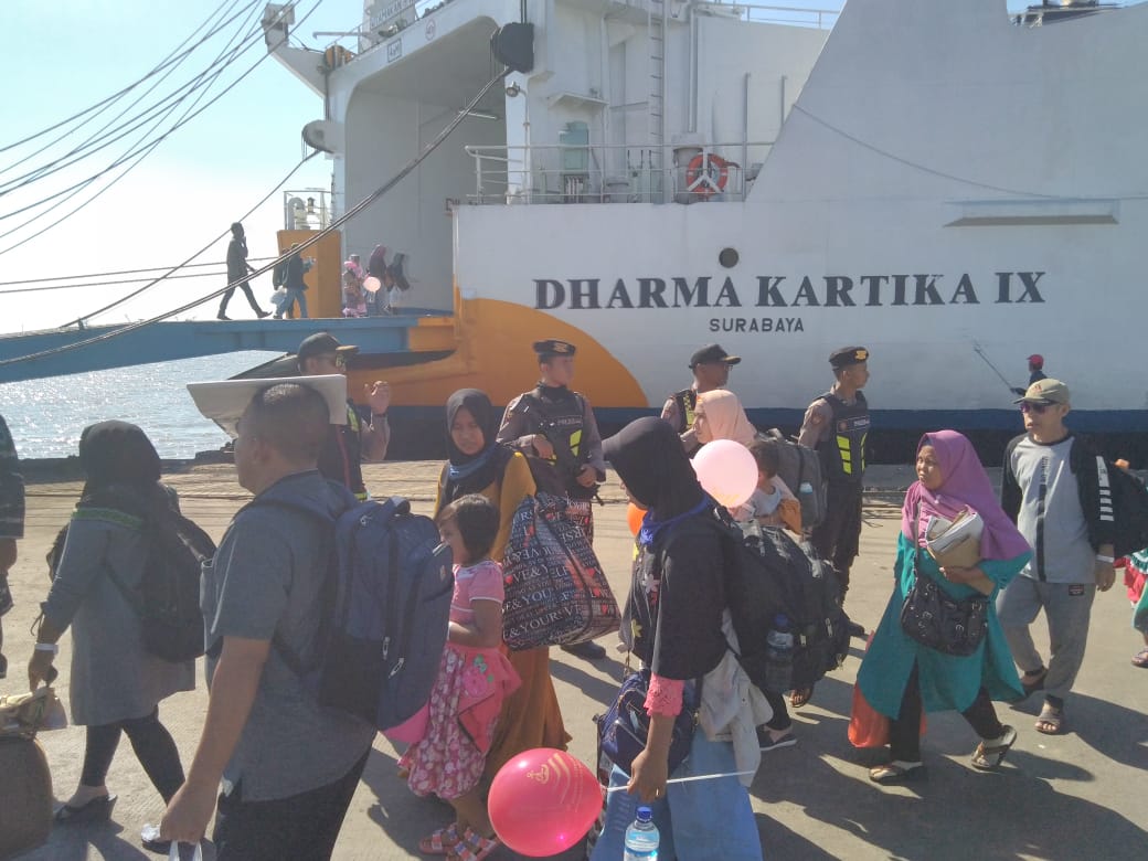 Seputarperak.com- Pengamanan arus balik Lebaran dilakukan anggota Satsabhara Polres Pelabuhan Tanjung Perak terhadap para penumpang kapal KM Dharma Kartika IX tujuan Banjarmasin di Pelabuhan Gapura Surya Nusantara (GSN), Senin sore, 10 Juni 2019.