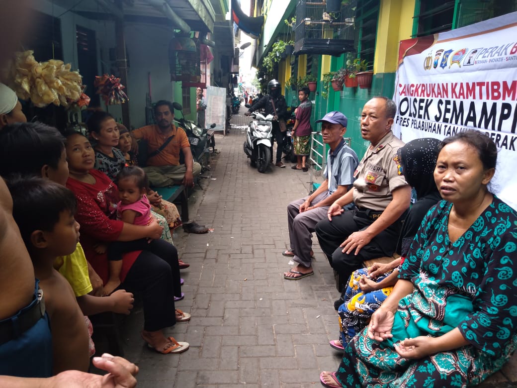 Seputarperak.com- Sosialisasi SPKT door to door disampaikan Ipda Munir, Panit Binmas Polsek Semampir, Polres Pelabuhan Tanjung Perak di acara cangkrukan bersama warga RT 03 RW 05 Kelurahan Ujung, Selasa siang, 18 Juni 2019.