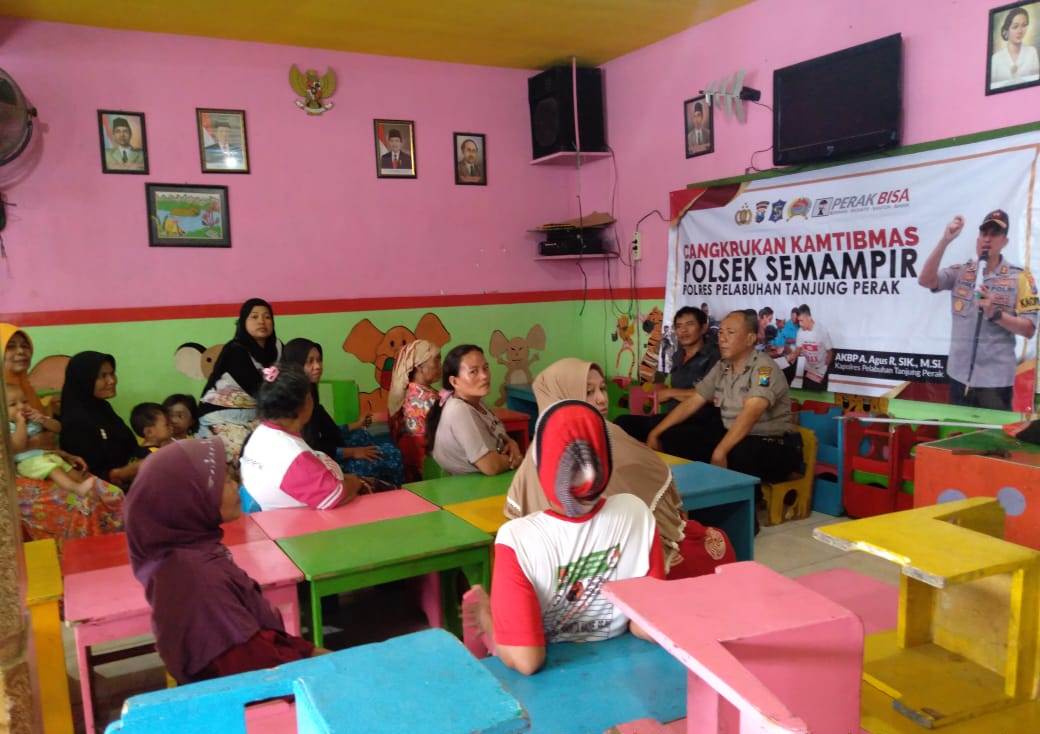 Seputarperak.com- Sosialisasi SPKT door to door disampaikan Ipda Munir, Panit Binmas Polsek Asemrowo, Polres Pelabuhan Tanjung Perak di acara cangkrukan bersama ibu-ibu warga Jalan Jatisrono RT 05 RW 10, Senin siang, 24 Juni 2019.