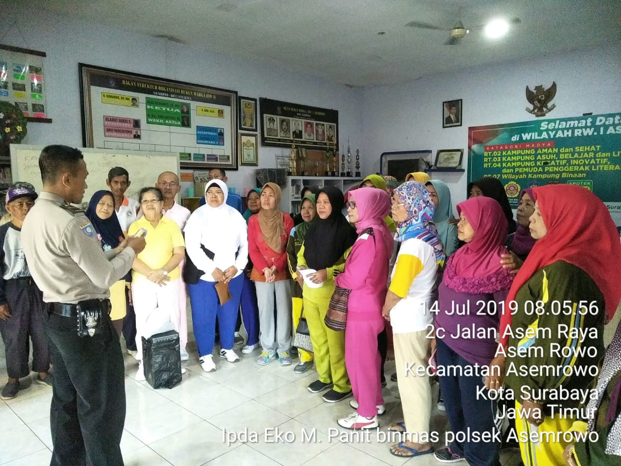 Seputarperak.com- Pesan waspada tindak kriminalitas disampaikan Ipda Eko Mustaghfirin, Panit Binmas Polsek Asemrowo, Polres Pelabuhan Tanjung Perak saat menemui ibu-ibu Lansia RW 01 Kelurahan Asemrowo.