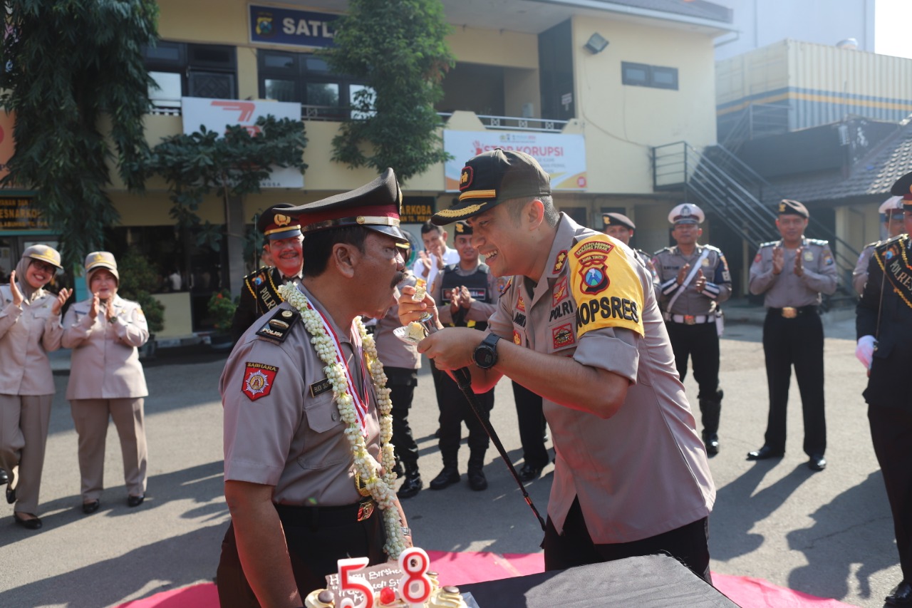 Saat itu juga dibacakan surat keputusan Kapolda Jatim terkait pensiun Ipda Budi Suroyo yang kini genap berusia 58 tahun.