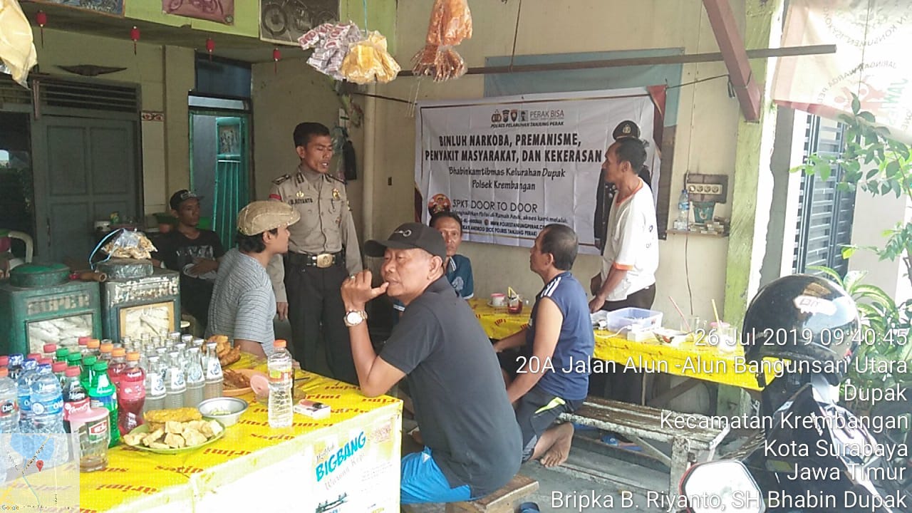 Seputarperak.com- Penyuluhan narkoba disampaikan Bripka Busaryanto, Babinkamtibmas Dupak, Polsek Krembangan, Polres Pelabuhan Tanjung Perak kepada warga Bangunsari, Jumat siang, 26 Juli 2019.