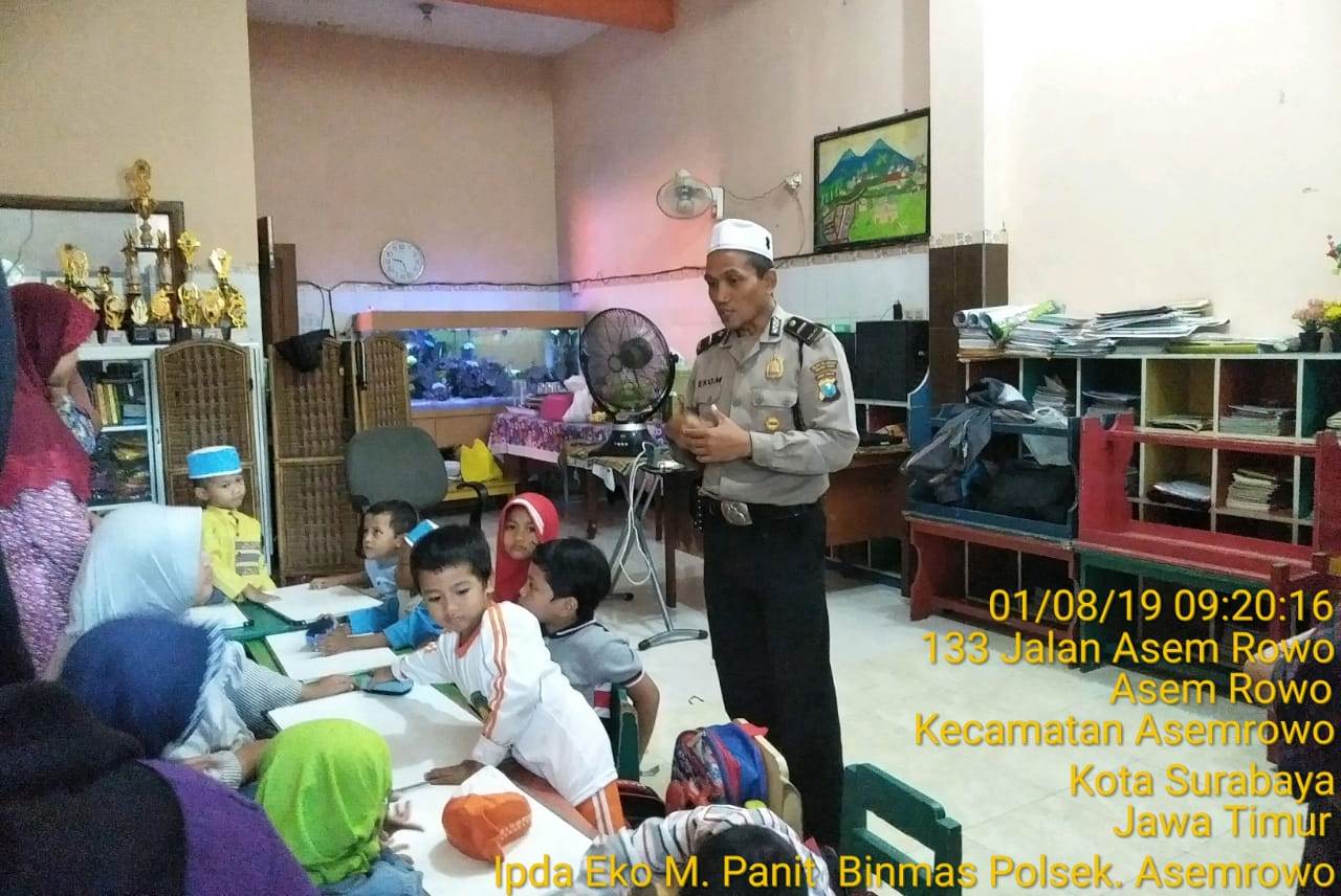 Seputarperak.com- Penyuluhan disampaikan Ipda Eko Mustaghfirin, Panit Binmas Polsek Asemrowo, Polres Pelabuhan Tanjung Perak kepada para murid TK An Nur di Jalan Asemrowo Kali, Kamis pagi, 1 Agustus 2019.